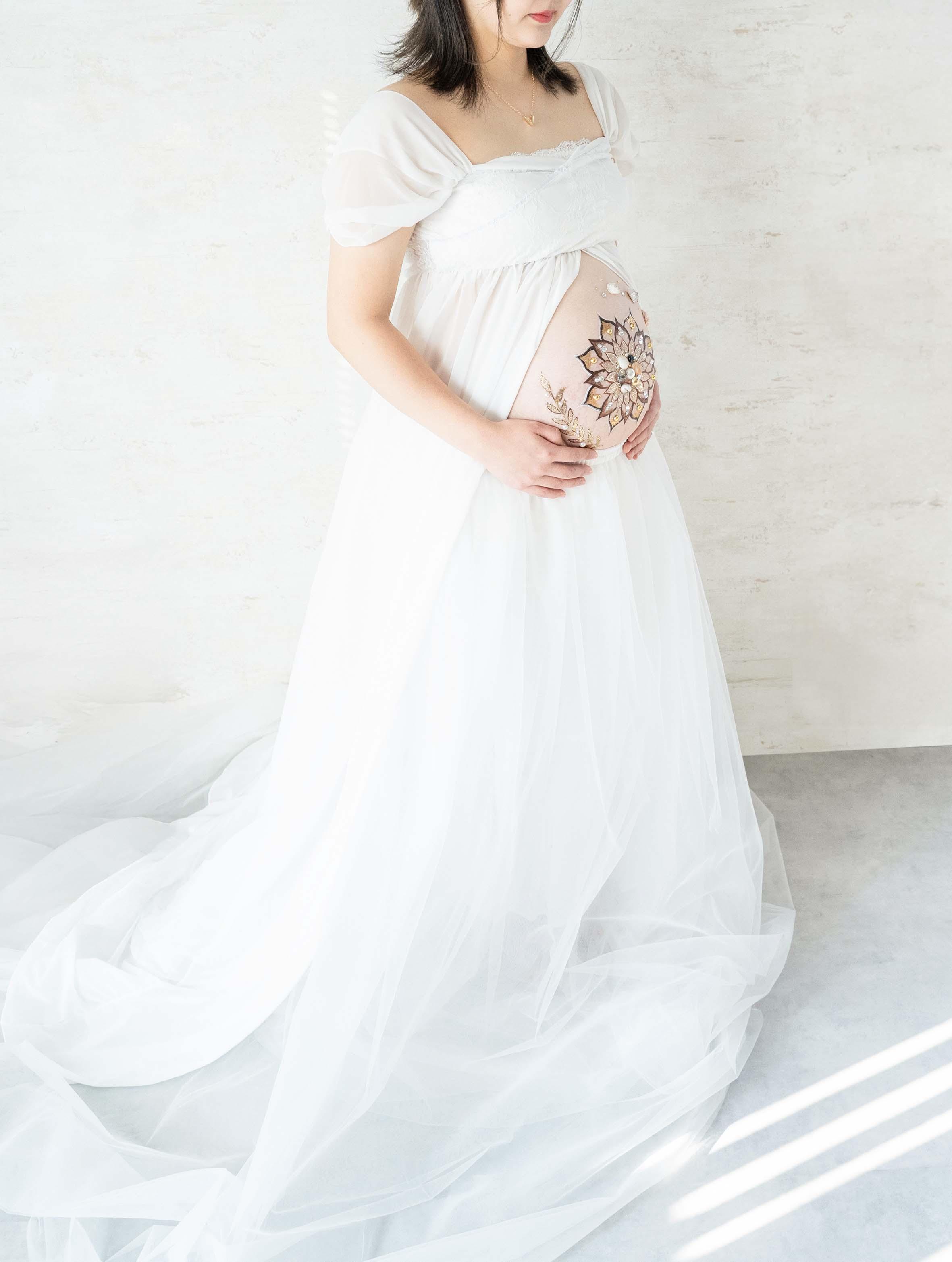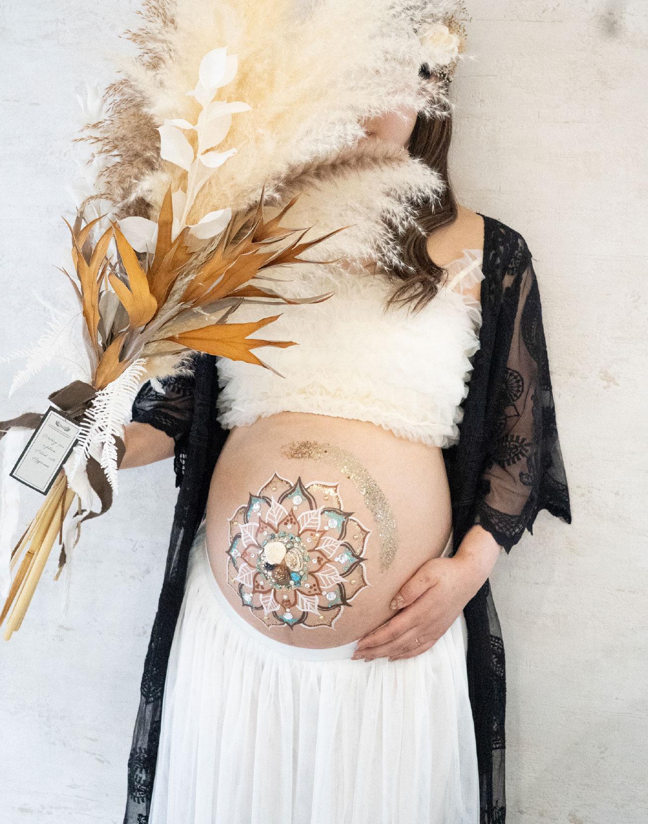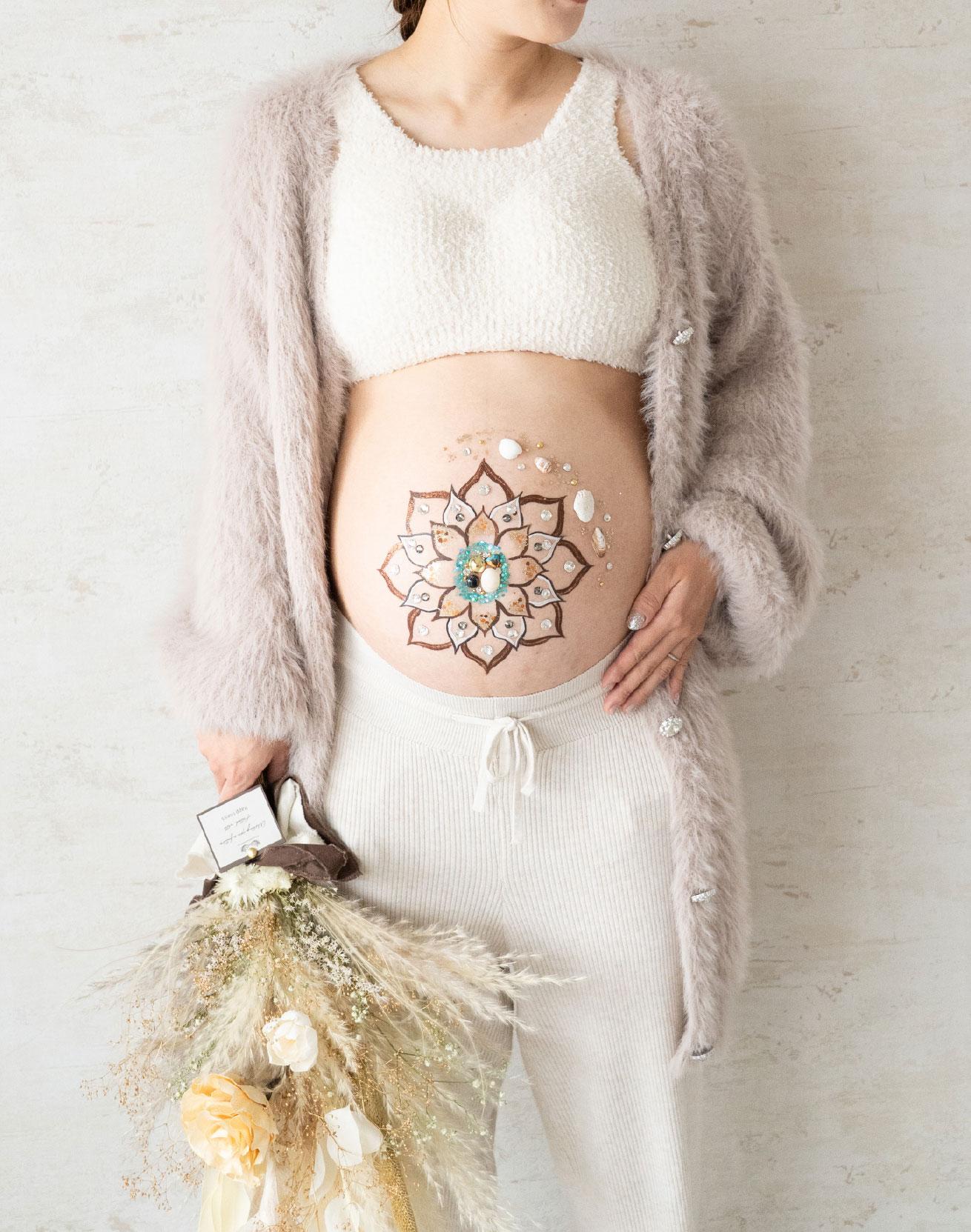 近年、人気が高まってきているジュエリーマタニティアート。スワロフスキーをはじめ、輝きの綺麗な石、高品質でパワーを持つ天然石を厳選して使用。圧倒的なお洒落感が魅力で、憧れのモデルさんがしていたことをきっかけに、他県からのお客様も多くお越しいただいてます。世界に1つだけのキラキラお洒落なオリジナルアートをぜひご体感ください。
